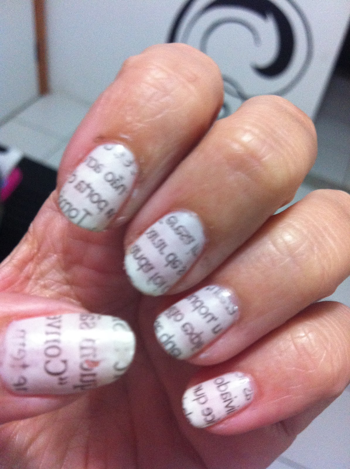 Passo 3: Colar as letrinhas. Usei papel de jornal (a parte que fala das novelas por ter as menores letras, isso não fooi muito intelectual da minha parte...). Só precisa fazer o papel entrar em contato com álcool, o álcool pode ser em gel ou líquido. Você pode: molhar o jornal, molhar sua unha, molhar o jornal em cima da sua unha com algodão vale tudo, precisa juntar jornal+álcoo.